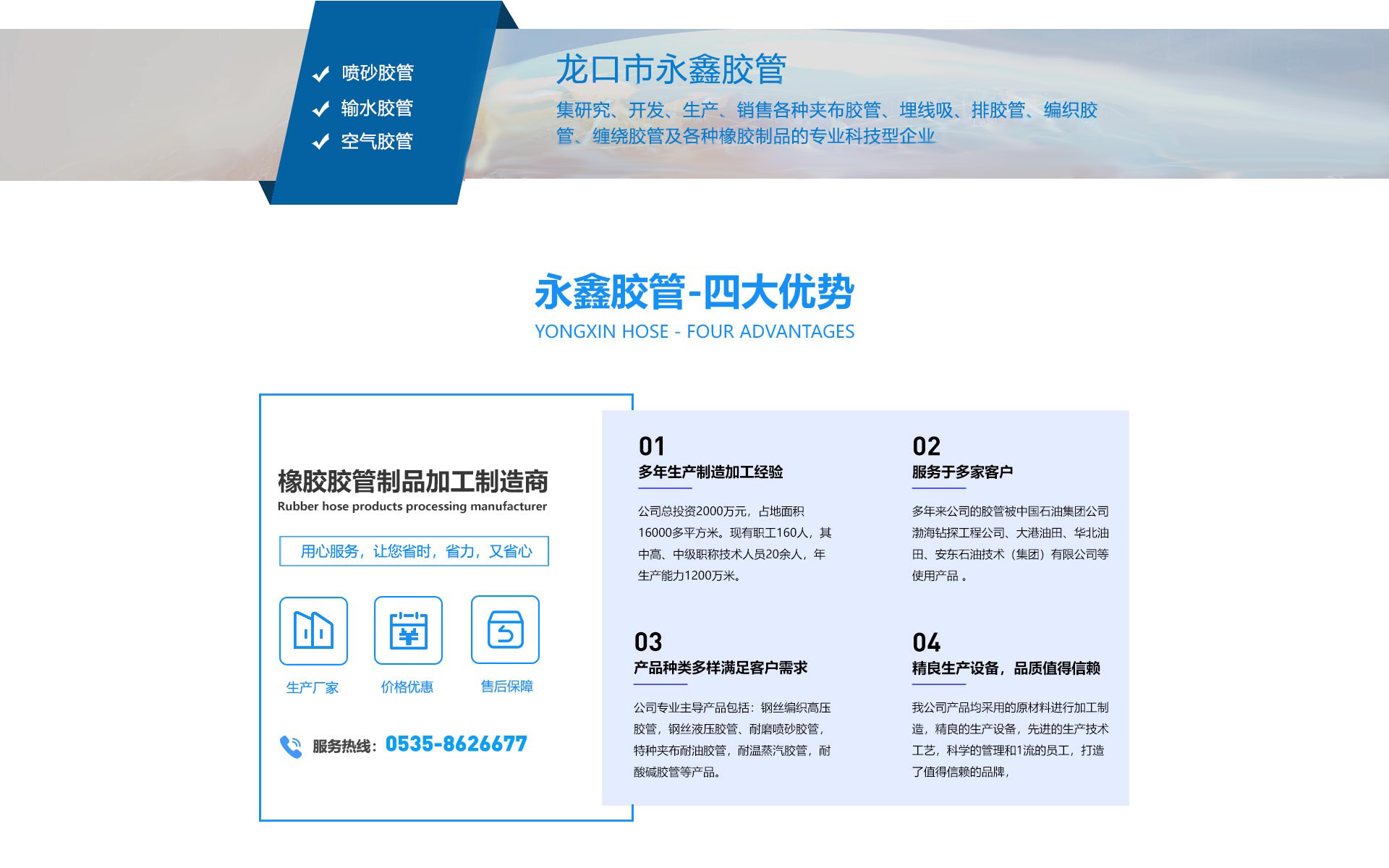 龍口市永鑫膠管有限公司始建于1979年。位于山東半島北端——龍口市,毗鄰龍口港、威烏高速公路和大萊龍鐵路,商業(yè)運(yùn)輸,交通方便,地理位置好。公司總投資2000萬元,占地面積16000多平方米。現(xiàn)有職工160人,其中高、中級職稱技術(shù)人員20余人,年生產(chǎn)能力1200萬米。多年來公司的膠管被中國石油集團(tuán)公司渤海鉆探工程公司、大港油田、華北油田、安東石油技術(shù)(集團(tuán))有限公司等使用產(chǎn)品我公司迎著十八界三中全會的改革大潮始終闊步向前,目前我公司主要從事高低壓橡膠軟管、鉆探膠管、夾布膠管、噴砂膠管、橡膠管帶制品,等產(chǎn)品的生產(chǎn)和研發(fā),主導(dǎo)產(chǎn)品包括:生產(chǎn),研制高低壓橡膠軟管、輸送皮帶等以橡塑為主的產(chǎn)品,擁有各類進(jìn)口,國產(chǎn)生產(chǎn)設(shè)備120多臺套,化驗(yàn),分析,試驗(yàn)儀器設(shè)備種類多,檢測手段完善。我公司產(chǎn)品均采用的原材料進(jìn)行加工制造,精良的生產(chǎn)設(shè)備和穩(wěn)定技術(shù)工藝,科學(xué)的管理,打造了客戶信任的牌子,先后與多家石油、化工、汽車制造等大型國有企...